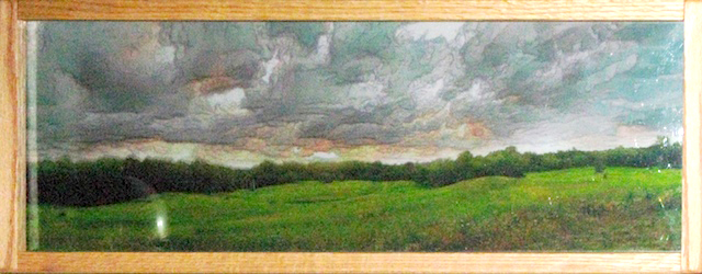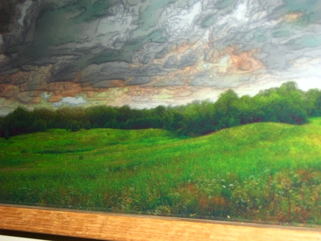 The original photograph was created by shooting twelve images and merging them together to make a panoramic image. This one image is printed in color and also in black and white with a filter. Both are printed on a film material with areas of see through capabilities. These two printed pieces are sandwiched together with a piece of Plexiglas between them.