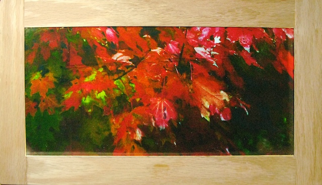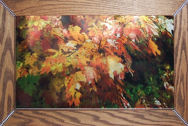 This piece consists of three layers. The top layer, a photograph of Fall leaves is printed on a sheet of film. The white areas do not print so they are clear and allow the image behind it to show through. The lighter the areas and more transparent the image. This image is repeated below the color image but is black and white. A piece of Plexiglas is sandwiched between the two pieces of film. The backing is a 1/4 inch piece of plywood that I painted shimmering gold. This helps reflect light and bounce it back through the front when light hits it. |